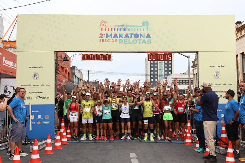 Largada em Pelotas (Foto: Paulo Rossi) As ruas de Pelotas foram tomadas por corredores neste domingo (12), durante a realização da 3ª Maratona Sesc de Pelotas, que somou mais de 3,6 mil participantes entre as provas de maratona, meia maratona, rústicas de 10 km e 5 km, além da caminhada. O evento, que vem colocando a Capital Nacional do Doce no mapa das grandes corridas do País, reuniu atletas de várias regiões do Rio Grande do Sul e também de estados como Ceará, Paraná e São Paulo, reforçando o caráter turístico da prova, que se torna uma opção interessante para