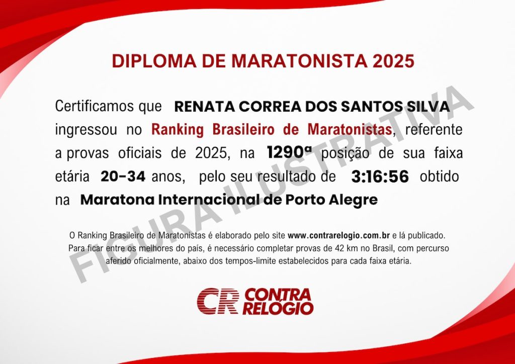 Todos os que conseguiram entrar no Ranking Brasileiro de Maratonistas 2025 terão direito a receber o DIPLOMA DE MARATONISTA, por terem se classificado entre os melhores no país, por faixa etária, correndo provas com percurso aferido de 42,2 km. No documento constará nome do ranqueado, sua classificação na categoria, a marca alcançada e em qual prova obteve o resultado que lhe garantiu a diplomação.